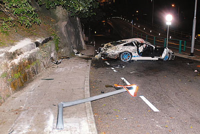 保时捷跑车失控撞倒路中有如起跳台的分隔石栏后,全车飞弹向左边路旁山坡,扫断路牌及撞石栏后才停下。(图片来源:文汇报)