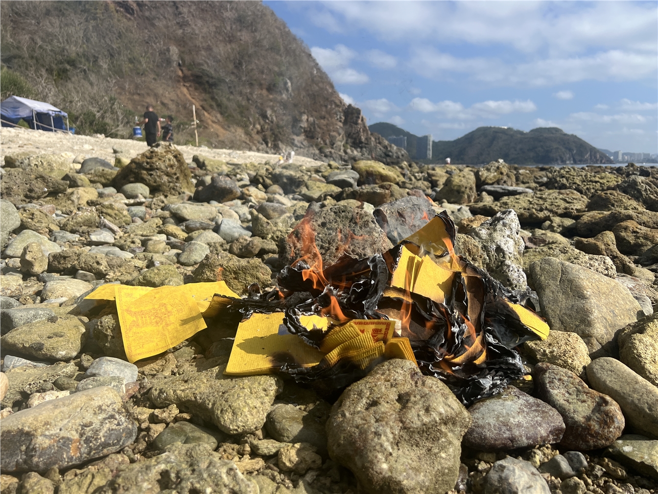 南海的太阳当头,看着黄纸在礁石上冉冉烧起,一张张化为灰烬。我们心中默念着老人 们的名字,祝他们在天堂安好!