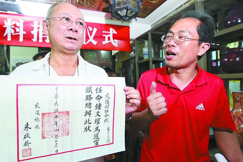 右图:钟仁国(左)捐出珍贵资料。本报记者 朱习 摄