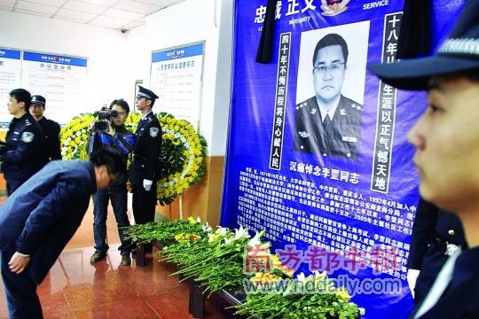 献花,鞠躬,默哀,追思。昨日,来自社会各界的上千名群众前往平湖派出所,用这种简单的方式向因公牺牲的平湖派出所副所长李罡告别。龙岗公安分局也举行追思会,不少李罡生前的同事为这位好兄弟、好战友的离去,惋惜、落泪。