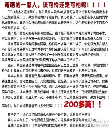 就算蔡鑫从18个月就做过胃的手术又怎样,医院不是说他康复了可心出院了吗,怎么就再弄个大出血呢?你们不是为了不让那些破仪器生锈,为了多赚几个黑心钱才叫病人去挨痛受苦的吗??