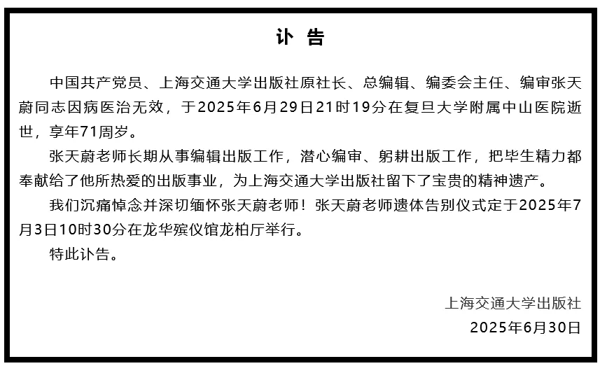 2025年7月1日,上海交通大学出版社发布讣告:中国共产党员、上海交通大学出版社原社长、总编辑、编委会主任、编审张天蔚同志因病医治无效,于2025年6月29日21时19分在复旦大学附属中山医院逝世,享年71周岁。