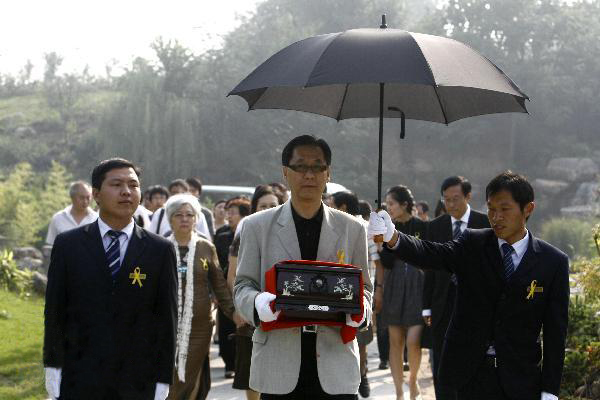 9月12日,柏杨先生的长子郭本诚(前中)手捧父亲骨灰前往安葬地。当日,原籍河南的已故台湾著名作家柏杨先生的骨灰在河南省郑州市河南福寿园陵园安葬,实现了柏杨先生“魂归故里”的遗愿。柏杨先生2008年4月逝世,其一生著述丰厚,知名作品包括《丑陋的中国人》《中国人史纲》等。