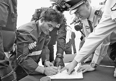 5月10日,北京首都国际机场,“金三角”特大武装贩毒集团首犯糯康在《逮捕证》上签字。万象摄(新华社发)