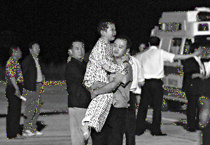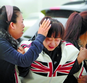 昨日,一位在伊春空难中失去亲人的家属(中)在机场门前悲痛不已。 新华社发