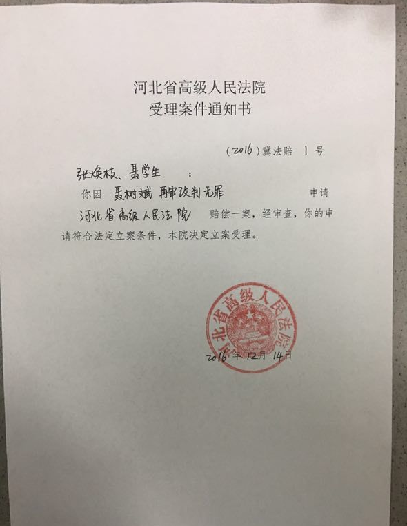 12月14日下午1点30分左右,聂树斌的母亲张焕枝在四川泽仁律师事务所律师辜光伟、北京京师(天津)律师事务所律师王殿学的陪同下,前往河北省高级人民法院,递交了聂树斌一案的刑事国家赔偿申请书。