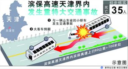 7日16时许,滨保高速天津界内发生一起重特大交通事故。初步核实,造成35人死亡。