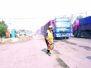 因车流量太大,路面上尽是坑,车上拉的东西总往下掉,特别是石头,有的就掉在路中央,大的有脸盆那么大。要想从路上抱上一块大石头,跑下来,不出事,要求速度一定要快,这个活儿,很危险。但是对于负责的环卫工人来说,那就是责任。