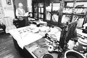 10月19日下午,记者来到这里,孙老正展纸、研墨,准备挥毫呢!书房里,翰墨飘香。南窗外,绿荫掩映。临窗的大书案上,笔、墨、纸、砚,一应俱全,还堆着些报刊、函件。书案后面的书柜里全是工具书,对面一排书柜装满诗词、书法类书籍。老诗人称,里面的每一本书里都有他的作品!