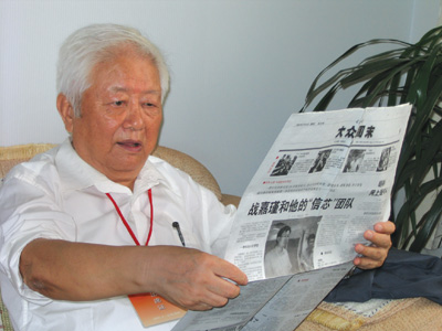 ▲孙轶青是《大众日报》的热心读者。这是他接受本报记者采访时阅读本报。摄影/刘海鹏