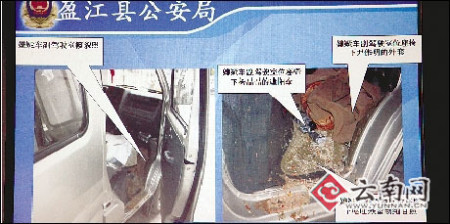 从现场照片来看,尹伟明驾驶的微型车副驾驶位置上有大量的呕吐物。杨晶晶裤子右侧、小腿外侧也发现呕吐的遗留物。“这说明杨晶晶就是从犯罪嫌疑人尹伟明驾驶的云N56567号轻型普通货车右前门(副驾驶位置)处坠落,并被车碾压致死的。”