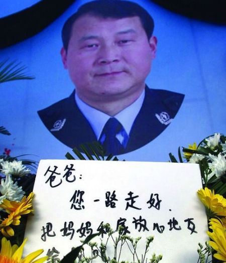 昨天,在民警徐宝民的灵堂前,摆着一个儿子徐雷送的花篮,上面有个牌子,写着:“爸爸,你一路走好,把妈妈和家放心地交给我吧!” 记者梁萌摄影