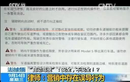 高巨斌代理律师 王贝贝:特斯拉在营销的过程中,把“自动驾驶”技术作为它最大的一个卖点,无论是广告宣传还是营销人员的介绍上,都是反复地在向消费者推销一个理念,就是你得信任特斯拉的“自动驾驶”技术,那么你一方面对这种不成熟的技术进行大张旗鼓的宣传,另一方面你又在一个不起眼的角落,在一个说明书,或者疑似宣传单页上告诉消费者,你的双手不应当离开方向盘,这本身就是矛盾的。
