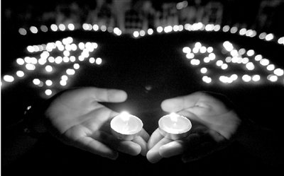 昨天,浙江省诸暨市天马实验学校的学生点燃蜡烛,为舟曲遇难同胞祈福。新华社发