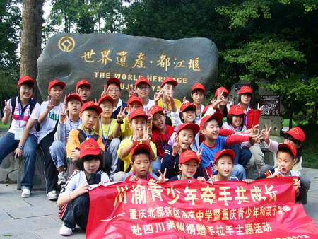 参加重庆青少年和亲子家庭赴四川崇州、都江堰捐赠及参观手拉手主题活动的重庆中小学学生、重庆《少年先锋报》的小记者一行三十余人当天来到青城山都江堰景区,参观了世界遗产都江堰水利工程和地震遗址。震后依然美丽的都江堰和从容坚强的都江堰人民给了孩子们留下了深刻的印象。