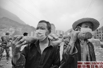 8月12日,天刚蒙蒙亮,乡亲们又起床出发了。更多的志愿者加入了救援的队伍。胳膊上系着红布的志愿者,在乱石错落的废墟上穿梭,源源不断地把矿泉水和方便面背上来,交给正在挖掘的乡亲们。傍晚的时候,消防官兵和乡亲们一起,挖到了刘开德的床,但是,人不在床上。