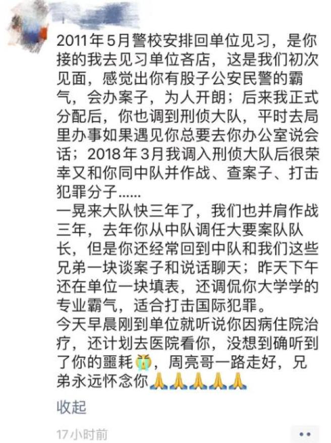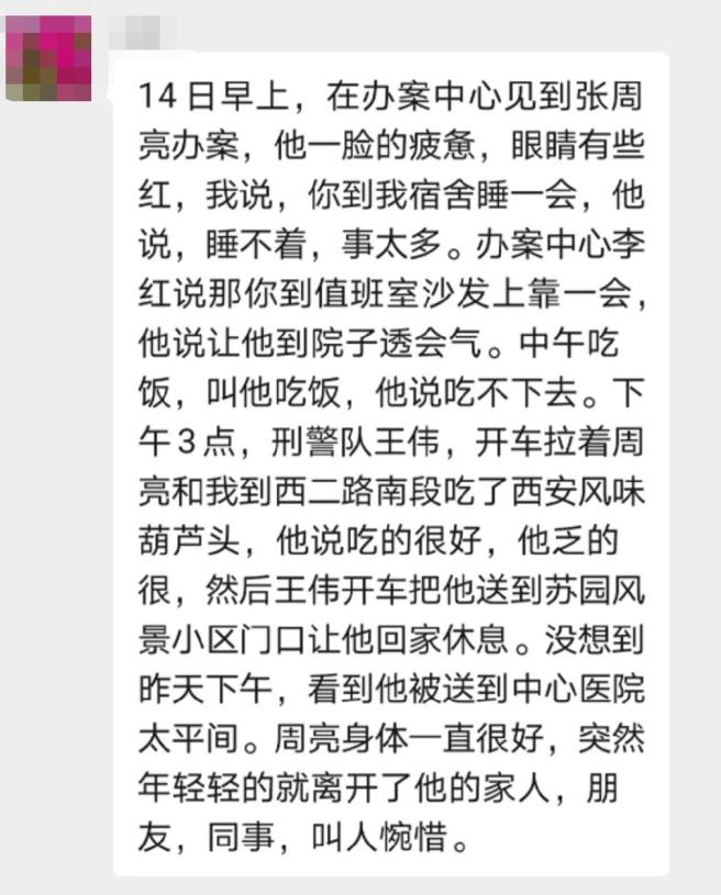 △张周亮同志1984年12月出生,生前被评为“全国挂牌扫黄打非案件办案有功个人”、市级“优秀公务员”“侦查破案标兵”“优秀民警”,荣获个人嘉奖两次。2020年1月被渭南市公安局评为“扫黑除恶”先进个人。