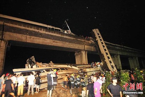 7月23日,从铁道部获悉,23日20时50分,杭深线永嘉至温州南间,北京南至福州D301次列车与杭州至福州南D3115次列车发生追尾事故。D301次列车第1至4位脱线,D3115次列车第15、16位脱线。记者从事故现场方面获悉,目前事故已造成11人死亡,89人被送往医院。中新社发 长空 摄 CNSPHOTO