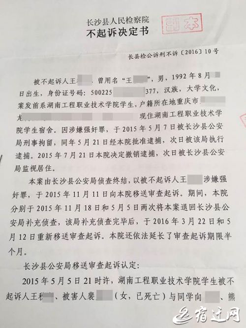 2016年5月12日,长沙县人民检察院以长沙县公安局认定的犯罪事实不清、证据不足,不符合起诉条件为由,决定对王某不起诉。