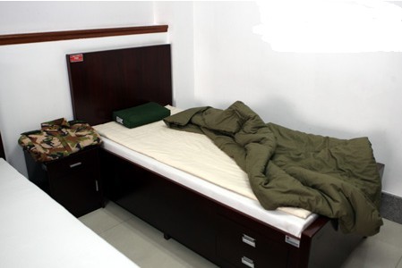 消防中队三楼的一个角落里,一床被子没有梳理,旁边的小桌子上摆放着一件迷彩作训服。这就是尹进良的床铺。按理说,他应该住干部房。