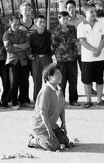 灵车即将离开厂区时,一人跪倒在地哭别李方洪。