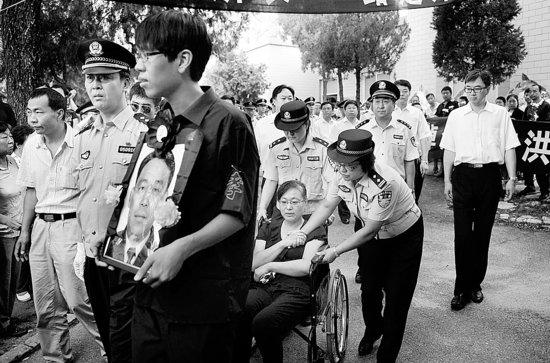 上午,李方洪84岁高龄的母亲、妻子,双双坐在轮椅上被推进了八宝山殡仪馆。输完液后的老人带着氧气袋进入了告别仪式现场。