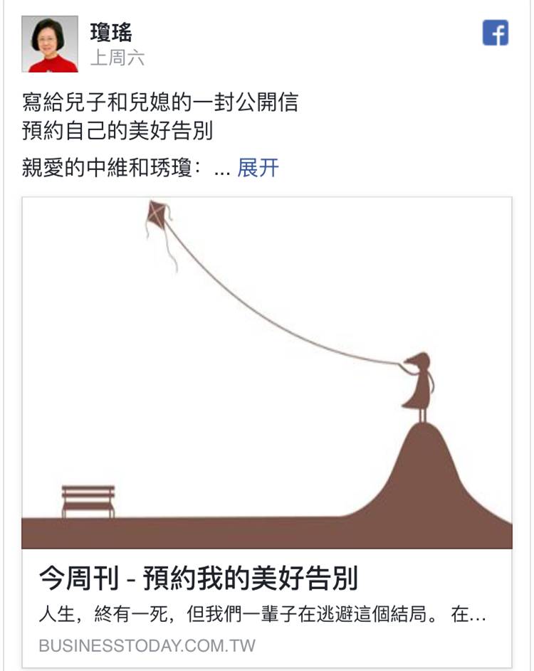 激动之余,她在FB上PO出一篇“生前预嘱”,向儿子和儿媳定下铁律,万一有一天成了卧床老人,到了弥留之际,希望不会因为后辈的不舍,让自己的躯壳被勉强留住而受折磨。文中反复强调: