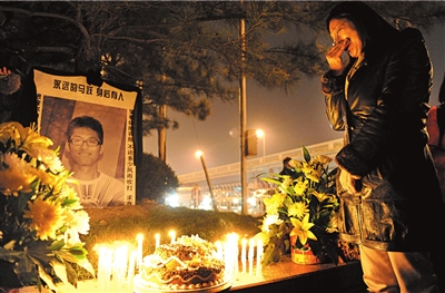 8月23日晚,大三学生马跃在地铁2号线鼓楼大街站坠轨触电身亡(本报曾多次报道)。昨天是地铁坠亡男孩马跃21岁生日,马跃家属、同学和素不相识的网友,齐聚鼓楼大街地铁站出口外,点起蜡烛,唱起歌,流泪祝福马跃生日快乐。