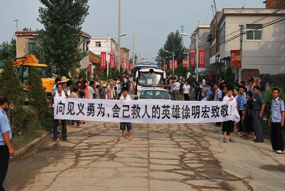 灵车前,两位被救少年拉着一幅“向见义勇为舍己救人的英雄徐明宏致敬”的挽联格外醒目。整个送行队伍中有年仅十多岁的学生,还有年过八旬的老人,劝桥村83岁的张玉文老人激动地说:“我虽然不认识徐明宏,但我听到他救人的事很感动,现在,像他这样的好人不多了。”“徐明宏,真是一位忠厚实在的人,遇见这种救人危险的事,别人早躲了,他却冲了上去,他是我们村的骄傲。”同村的陶瑞君村民这样评价道。