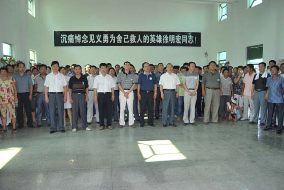 “看,徐明宏来了!”当载着徐明宏大幅遗像的灵车缓缓驶过时,干部、群众、老师、学生纷纷涌了上来,大家胸带白花,手拉着一幅幅“好人徐明宏,潘集人民的骄傲!”、“淮水作证,浩气永存!等标语挽联,眼含热泪,共同地为英雄徐明宏送上最后一程。
