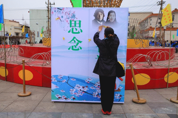 “桃花红雨英雄血,碧海丹霞志士心。今日神州看奋起,陵园千古慰忠魂!