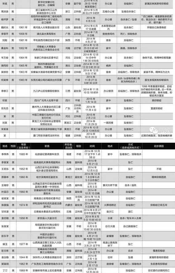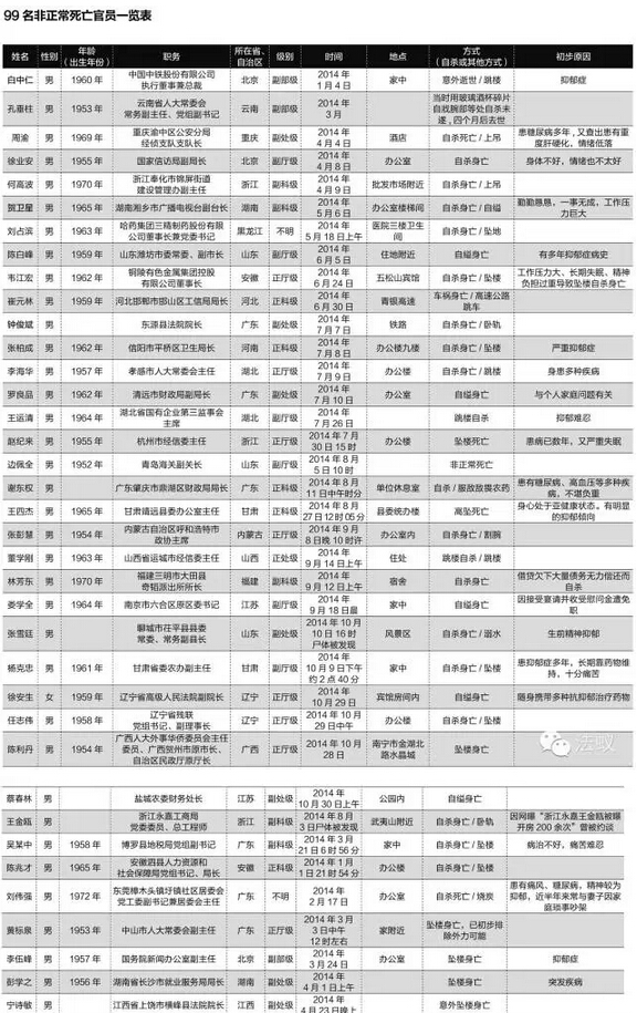 利用公开信息,《财经》记者搜集整理了一份官员非正常死亡情况表,主要统计对象是经认定为自杀的案例或疑似自杀案例,少数案例属于未经证实是自杀或他杀等意外导致的非正常死亡。统计时间是自中共“十八大”后的2012年12月至2015年2月7日,共收集整理了99个案例。因无法掌握全面情况,这是一份不完全统计表(见文末)。