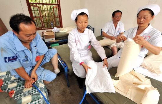 7月1日,在贵州关岭岗乌镇“6-28”滑坡灾害抢险救援现场1号安置点,医务人员正在准备气垫枕。新华社记者杨楹摄