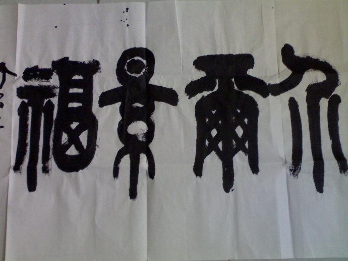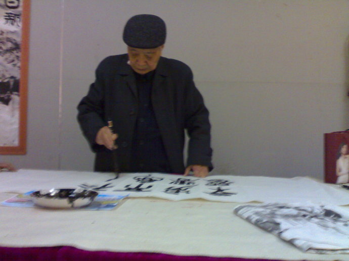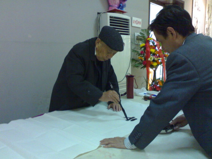 老人可能有点感冒,一边流着清涕,一边书写着,但见老人手不颤,笔不抖,很难想象这是一位91岁的长者了。我没有带相机,只好用手机拍下老人篆书时的照片。老人笔耕不辍,待人以诚,不求于人,刻苦勤奋工作的精神深深打动着我。我很幸运2010年12月4日早晨成为进入曾彩初老人娄底博物馆书画展展厅的第一人,有幸感受和目睹曾老的为人和处世,并不自觉接受了老人的言传身教。老人的精神,使我终生难忘,值得终生学习。