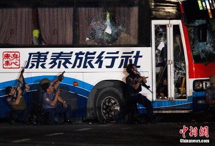 特警把旅游巴士团团包围,警察曾把后挡风玻璃打碎,并试图强攻旅游巴士。至晚上接近9时,枪手被击毙后,巴士内的幸存者才陆续被救出来。