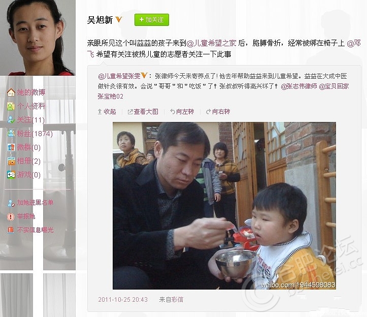 在2011年12月14日,益益过世的时候,这个微博,就连续4篇发出了对益益离去唏嘘不已的微博。益益的确是个可怜的孩子,被母亲殴打致残,现在也莫名其妙的在儿童之家离世,到底她的背后有着一个怎样的故事呢?
