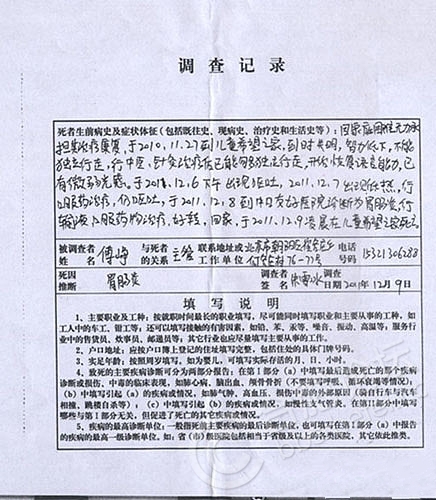 附上调查记录,内容为:因家庭困难无力承担其治疗康复,与2010.11.27到儿童希望之家。到时失明,智力低下,不能独立行走。经中医针灸治疗后,已能够独立行走,开始恢复语言能力,已有微弱光感。于2011.12.6下午出现呕吐,2011.12.7出现低热,经口服药之劳,仍呕吐,于2011.12.8到中日友好医院诊断为肠胃炎。经输液口服药治疗,好转,回家。于2011年12月9凌晨在儿童希望之家死亡