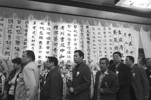 环顾整个灵堂,淡雅中透着灵气,生前好友们送的挽联挂满了,看上去就像一个书法展。“武宿文光声名孚,中华奇笔翰墨耀”……“奇人奇书,中正中和”很多挽联还把“武中奇”三个字暗含了进去。很多书画界的大腕也都写了挽联,赵绪成的“横刀立马定江山,纵笔挥毫著华章”和尉天池的“书坛尊巨擎,艺苑铸勋功”两对挽联,一左一右特别显眼。参加告别会的人们,在送别武老的同时,都忍不住要多看几眼墙上的挽联。