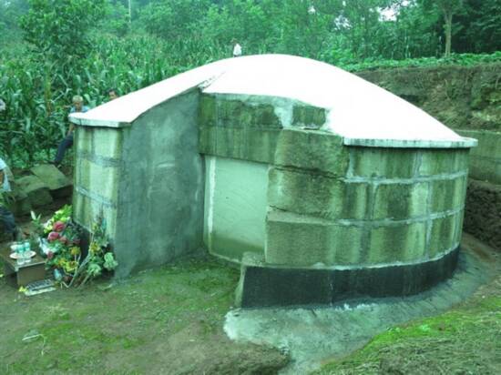 主体工程完工后,再在沿石缝中勾出一条8公分宽的一个糟来,用水泥混凝土粘合好,再用特制的工具拉成一个《工》字型的造型。十分好看。外型石头打整出平面。统一做成条二寸的格式,第四天,把顶上保护园形顶面的稻草清除完,并用毛巾擦洗干净。对于下面的石头我还不放心,买了两大桶沥青漆,从外墙的顶部刷到脚部,反复刷,只要有缝隙的地方都要凝聚到,假如把坟放入水中也不可能有水浸入。