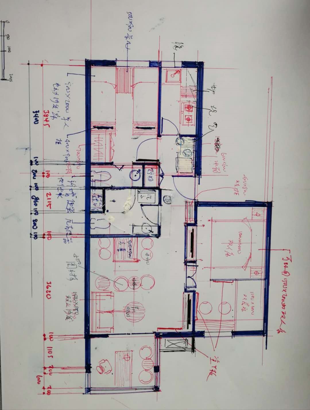 后来更让我受宠若惊的是,转天很快的,老先生发来了一张手绘设计稿,我和家人看后都惊呆了。手稿如此之细,还注有家具尺寸。吴老还反复推敲,优化了一版设计方案。