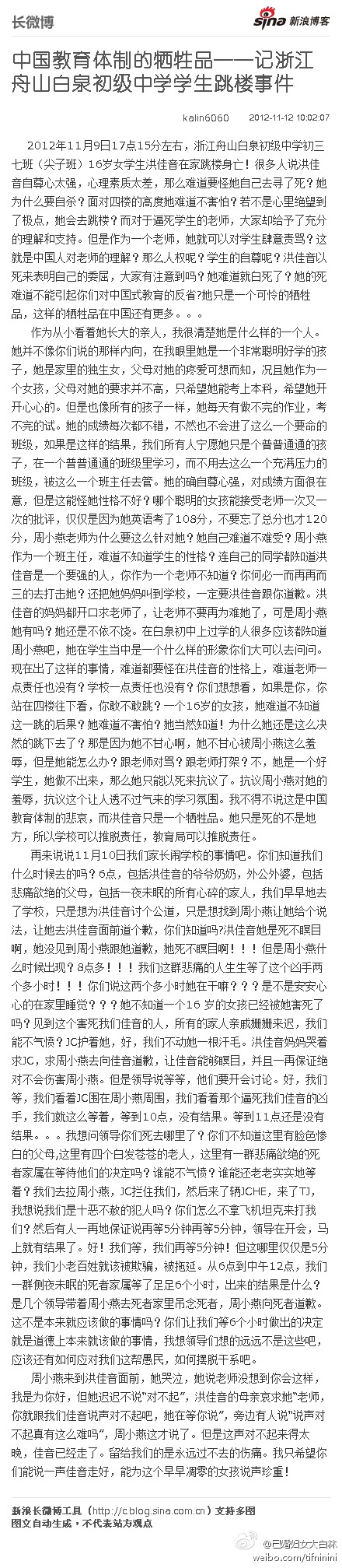 心情很沉重,佳音走好。 关于这件事,我作为过来人(我儿子今年高三)也想替老师说两句话,虽说现在也有师德缺失的,但是绝大部分老师是负责的,尤其能成为尖子班的老师肯定有她的优点,出了事就全盘否定太伤人心了。青春期的孩子不“凶”你根本镇不住,不“凶”成绩就会坐过山车,因此请理解周老师的苦心,相信她现在的难过不会少于你们家属。