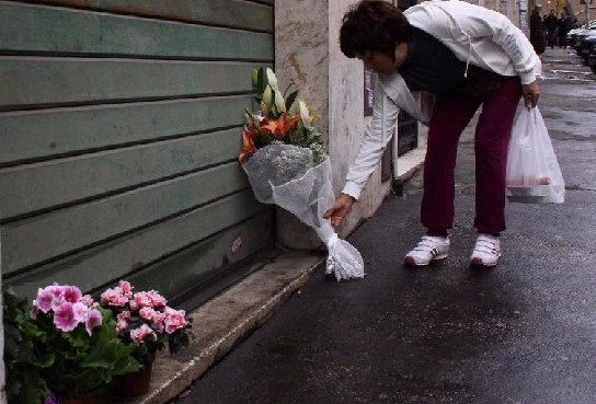 1月5日,在意大利罗马,当地华人献花缅怀遇难同胞。意大利罗马4日晚发生一起抢劫案,导致一个华人三口之家两人死亡、一人受伤。这对夫妇在罗马经营酒吧和汇款公司,案发当晚在住宅楼前遭到两名蒙面歹