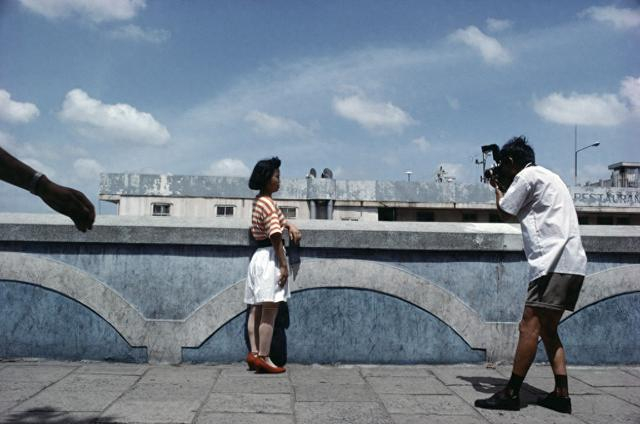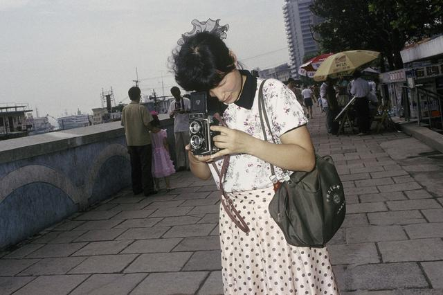 带着她的海鸥相机在外滩上拍摄,上海,1990。罗伯特·凡德·休斯特 作品