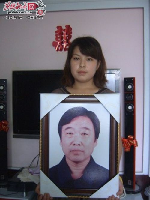 郭占起女儿拿着父亲遗像