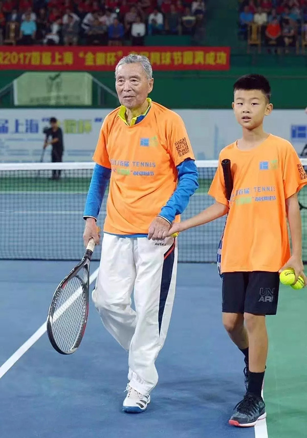 2017年,时年88岁的梅老受邀参加上海市民网球节开幕式,与小队员切磋球技。