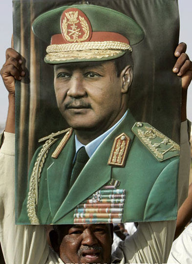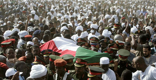 5月31日,在苏丹恩图曼,军人们在前总统加法尔·穆罕默德·尼迈里的葬礼上抬着尼迈里的遗体。前总统尼迈里于5月30日去世。