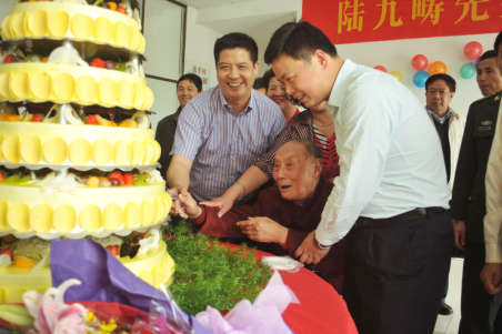 生日宴会上,陆老风趣地表示:“盛世中国,我活得很高兴,要活到‘准’一百岁,这个头衔大家都要争取哦。”(通讯员 杨成林 周成 记者 寿光晓)