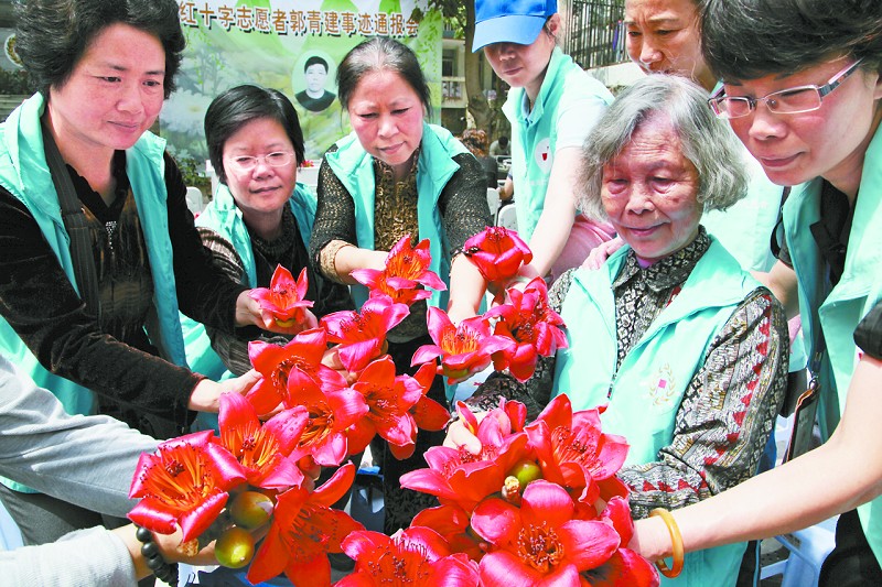 在市红会的院落中,志愿者郭青建的遗像喷绘在苍松翠柏的背景图案中,每个与会人员将手中火红的木棉花依次摆放在案头,以示对献血英雄的缅怀。