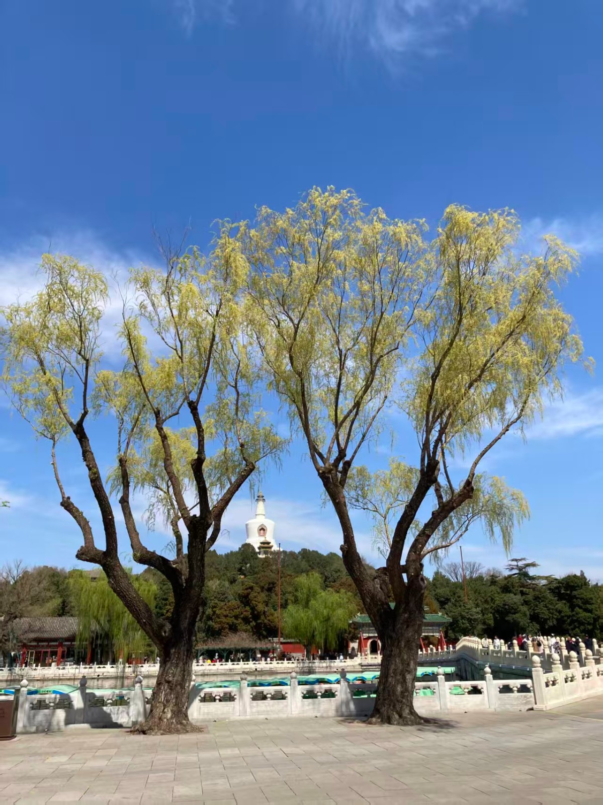 看到了这张新片,两棵垂杨柳在白塔前并排而立,我突然想起了三毛《致自己》