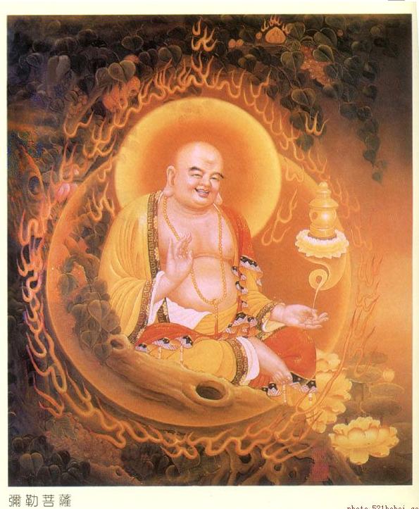 瑜伽释八页云:三乘行者、由闻思等,次第习行如是瑜伽,随分满足;展转调化诸有情故;名瑜伽师。或诸如来、证瑜伽满;随其所应,持此瑜伽、调化一切圣弟子等,令其次第修正行故;名瑜伽师。地、谓境界、所依、所行,或所摄义。是瑜伽师所行境界,故名为地。如龙马地。唯此中行;不出外故。或瑜伽师、依此处所,增长白法;故名为地。如稼穑地。或瑜伽师地所摄智、依此现行,依此增长;故名为地。如珍宝地。或瑜伽师、行在此中、受用白法;故名为地。如牛王地。或诸如来、名瑜伽师。平等智等、行在一切无戏论界无住涅盘瑜伽中故。是彼所摄,故名为地。或十七地、摄属一切瑜伽师故。如国王地。是故说名瑜伽师地。问答决择诸法性相、故名为论。欲令证得瑜伽师地而说此论,故以为名。如对法论。或复此论、无倒辩说瑜伽师地,故以为称。如十地称。或复此论、依止此地,故以为号。如水陆花。由是论名瑜伽师地。 无论天南海北,在香火旺盛的寺院中,总能看到一尊袒胸露腹、喜笑颜开、手携布袋席地而坐的胖菩萨,他就是弥勒佛。